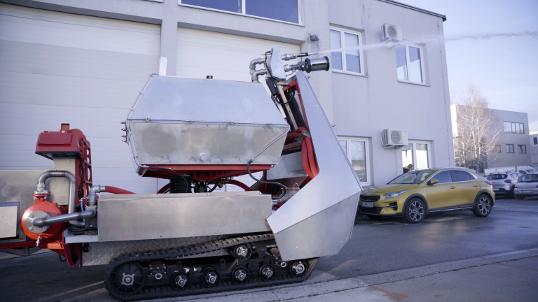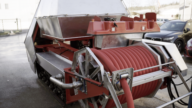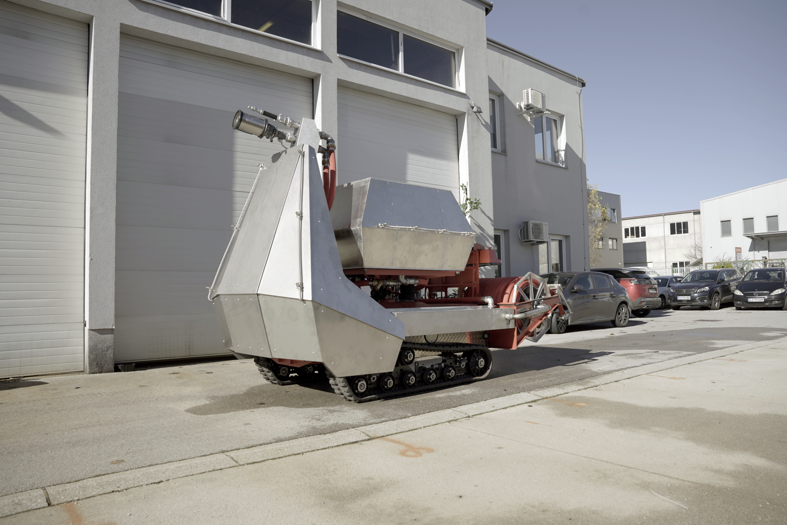 High-torque tracked system conquers any terrain be it mud, sand, snow, or gravel, while the gravity stabilized cistern enables operation on inclines up to 38°.